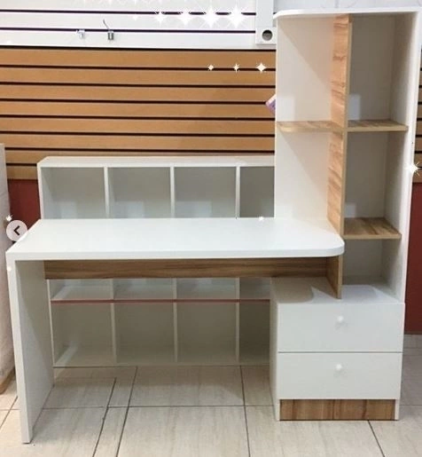 Mesa 2 gavetas com armario prateleira home office MDF branco c/ amadeirado